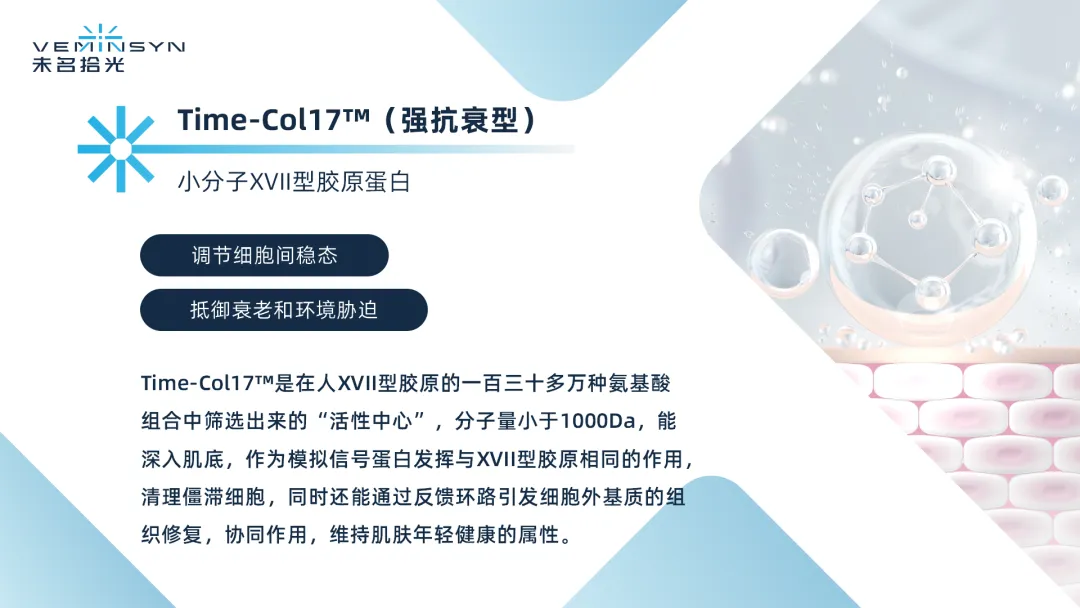 以胶原蛋白产品为例,未名拾光的新型原料Time-COL17 已实现量产和市场拓展。据了解,该产品在保留17型胶原蛋白关键活性位点(如甘氨酸特征序列GXY)的同时,使其可以通过护肤途径吸收,极大地拓展了下游护肤品牌的应用场景和产品形态。